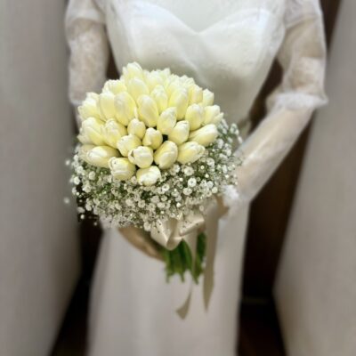 白いチューリップとかすみ草のクラッチブーケです♡ウェデングブーケ専門店