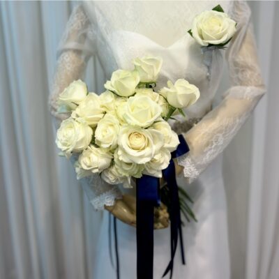 中輪の白バラを約30本、ふんわりとランダムに束ねたナチュラルなクラッチブーケです。空気を含んだような軽やかなシルエットが、花嫁様の可憐さを引き立てます。