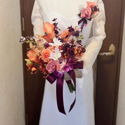 モスグリーンのドレスにマッチするクラッチブーケ♡ウェデングブーケ専門店
