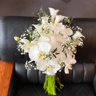 胡蝶蘭の優雅な美しさを主役に、カラーの凛としたライン、かすみ草の柔らかさ、ユーカリのナチュラルなグリーンを束ねたクラッチブーケです。