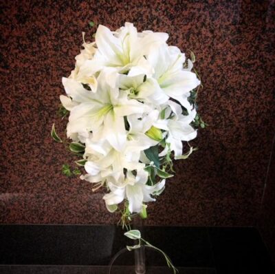 白く気高い輝きを放つ大輪のユリ「カサブランカ」を主役にした、ショートキャスケードタイプのウェディングブーケです。