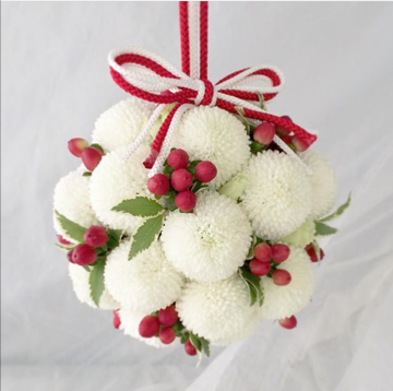 白く丸いフォルムが愛らしいピンポンマムを主役に、鮮やかな赤いヒペリカムの実と、ピットの葉を添えたボールブーケ。和紐で仕立てた持ち手が、和装にしっくりと馴染み、花嫁様の美しさを一層引き立てます。