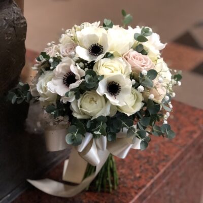 白バラと淡いピンクのバラをベースに、かすみ草やユーカリを合わせたナチュラルで上品なクラッチブーケ。そこにアクセントとして造花のアネモネを取り入れることで、洗練された印象と個性を両立しました。