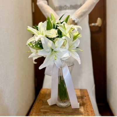 白ユリとかすみ草のクラッチブーケです♡ウェデングブーケ専門店