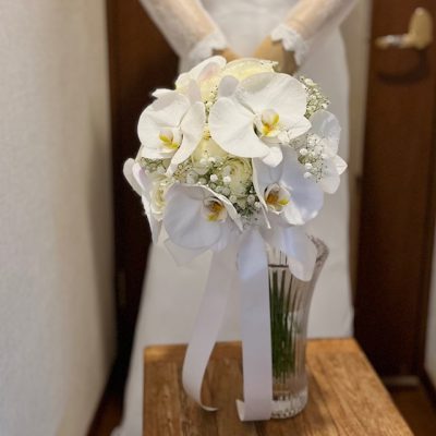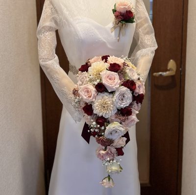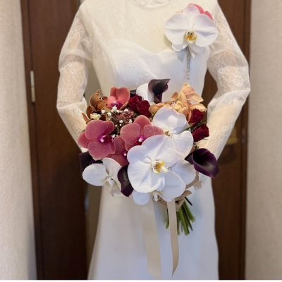 生花のブーケも、造花のフープブーケもとても素敵でした。ドレスともピッタリで、友人や親族からも好評でした。
