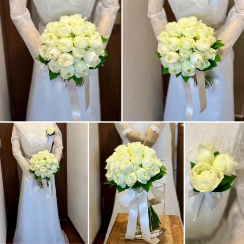 コロンとしたカップ咲の白バラ(ブルゴーニュ)は花弁が丸く重なりふっくらとしたフォルムで大人の女性の持つ柔らかく優美さを出してくれます。